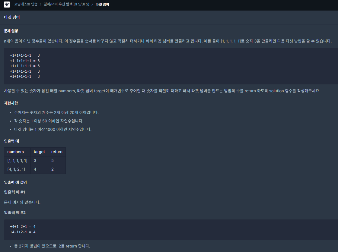 https://school.programmers.co.kr/learn/courses/30/lessons/43165?language=java 문제 설명 그래프의 모든 정점을 순회하면서 target에 해당하는 계산식을 찾는다. 백트래킹이므로 dfs로 구현한다. class Solution { int count = 0; public int solution(int[] numbers, int target) { int answer = 0; dfs(numbers, target, 0, 0); // depth, result answer = this.count; return answer; } public void dfs(int[] numbers, int target, int depth, int result) { if(dep..